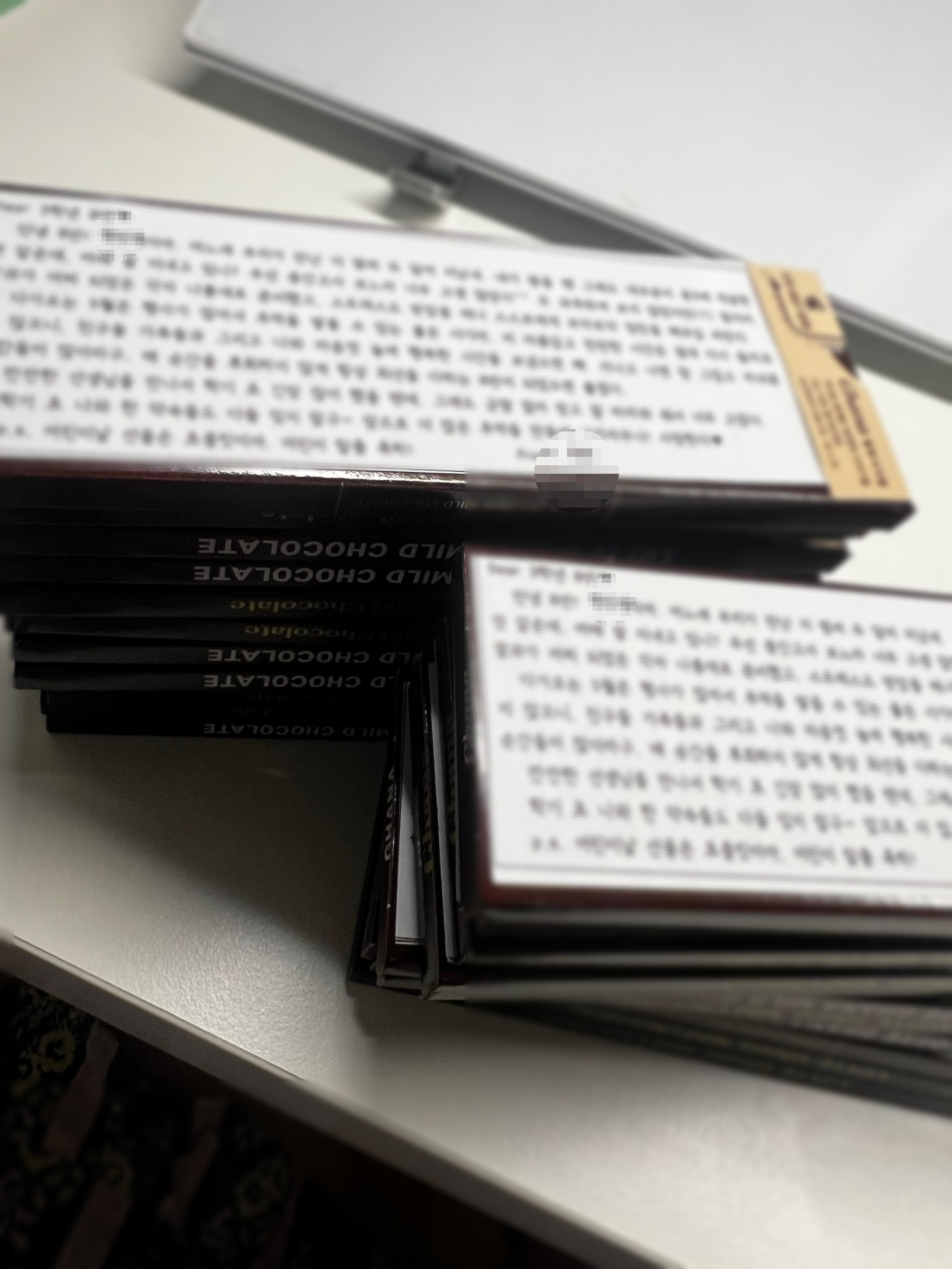 앞장에는 가나초콜릿 양식, 뒷장에는 중간고사 끝난 기념으로 반 아이들한테 편지를 적어서 붙였다.