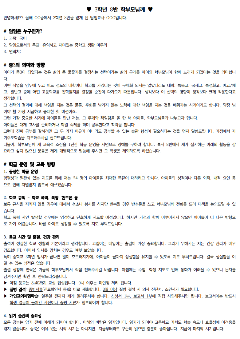 우리 반 학급 관련해서는 예전에 다른 선생님 자료를 다운받아서 내 입맛대로 수정한 게 있었다. 이렇게 줄글로 쓴 걸 인쇄해서 나눠드렸다.